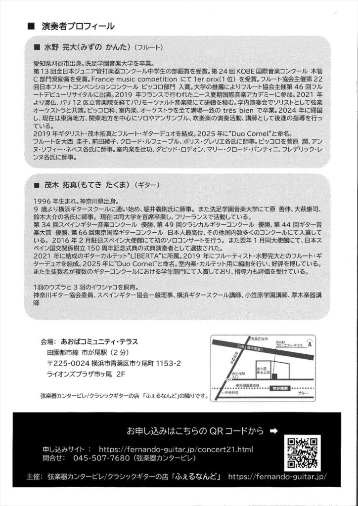 フルート奏者の水野完大さんと茂木先生の二重奏が開催されます。2019年に結成したフルート・ギターデュオ。Duo Cornel の演奏会です。